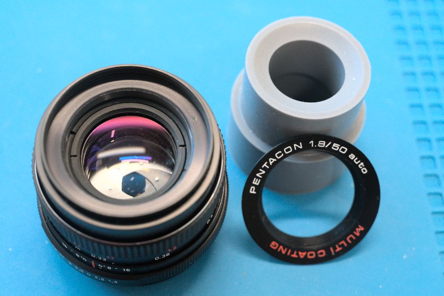 The Pentacon 50mm f/1.8 is famous for its painterly bokeh wide open, and for its sharpness when stopped down. And often, it can be found rather cheaply, frequently together with a Praktica camera. However, in most of these lenses the old grease became stiff, making the focusing hard. And often oil on the aperture blades causes the aperture to get sticky and close either slowly or not at all. So, to enjoy working with the lens, it needs some cleaning and re-lubing. Here, I'm showing this for the "red" (middle) version. Instructions for other versions of this lens can be found here.