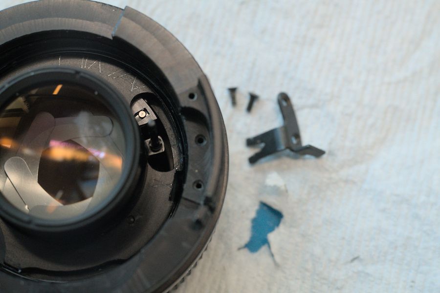Now, keeping the ring at infinity, I remove the three screws that hold the focus ring. But I make sure to make a little scratch on both pieces (or see if there's already a mark), so I can place it back later exactly as it was at infinity. At the end, if your infinity focus is slightly off, you can loosen these screws and make fine adjustments.